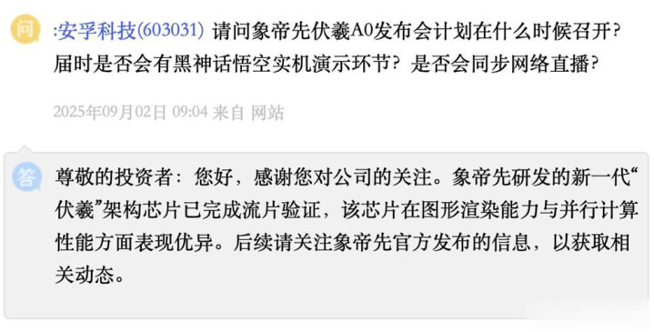 芯东西9月4日报道,国内消费电池龙头南孚电池所属公司安孚科技近日在投资者互动平台上透露,重庆GPU公司象帝先研发的新一代“伏羲”架构芯片已完成流片验证。该芯片在图形渲染能力与并行计算性能方面表现优异,性能和技术指标可对标国际主流显示芯片先进水平。