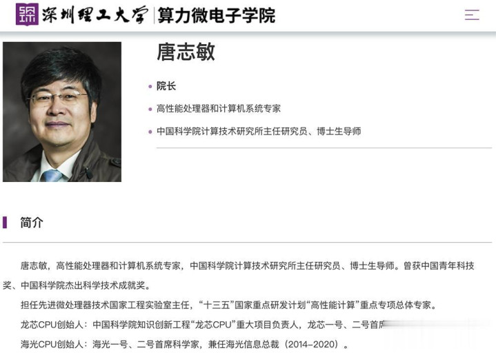 ▲唐志敏在深圳理工大学算力微电子学院网站的简介