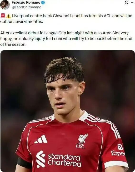 “莱奥尼在联赛杯首秀中表现出色、斯洛特对他十分满意,但他却不幸受伤。莱奥尼将努力争取在本赛季结束前回归。”