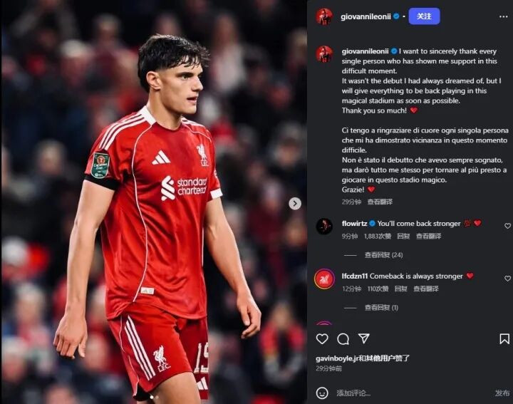 利物浦官方尚未公布莱奥尼的伤情,莱奥尼更新社媒,向球迷的祝福表达谢意。