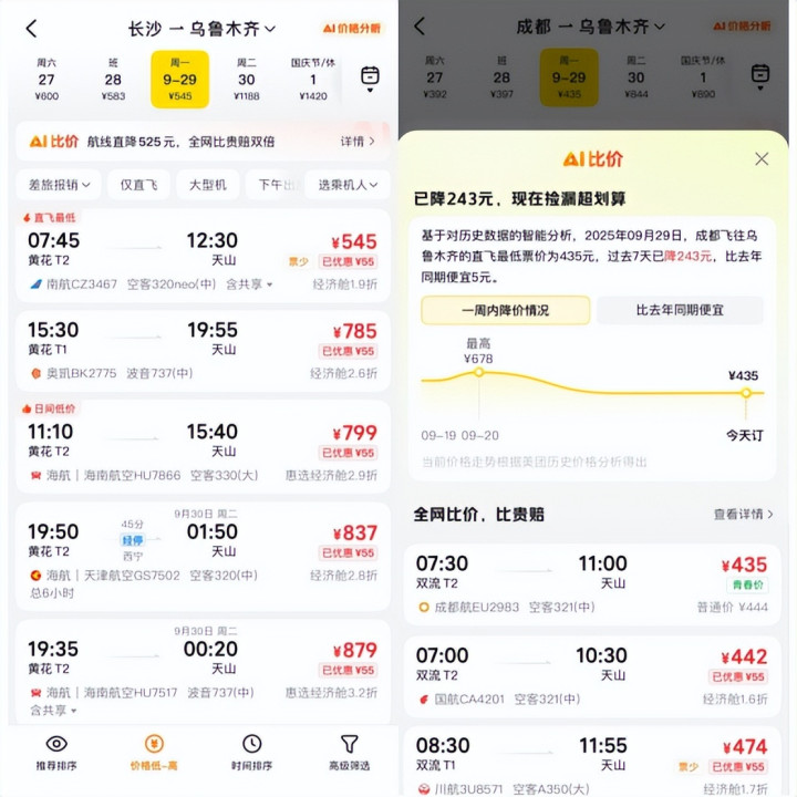 美团方面对中国新闻周刊表示,9月26日美团AI比价功能显示,以9月29日长沙飞往乌鲁木齐的直飞航班为例,最低票价不足600元,过去7天该航线直飞最低票价降幅达49%。