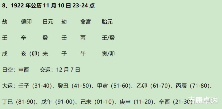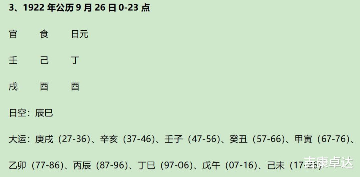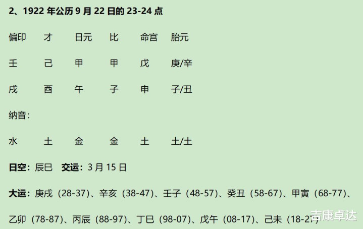 1922年公历10月1日这个时间,这个时间也比较容易排除:12个时辰都成不了化格,都是正常格局;家庭好,有弟弟,月上的就是官星而不是七杀,甲寅运(1965-1974)就不好,实际此运担任教授、研究所所长因此是不符合的。