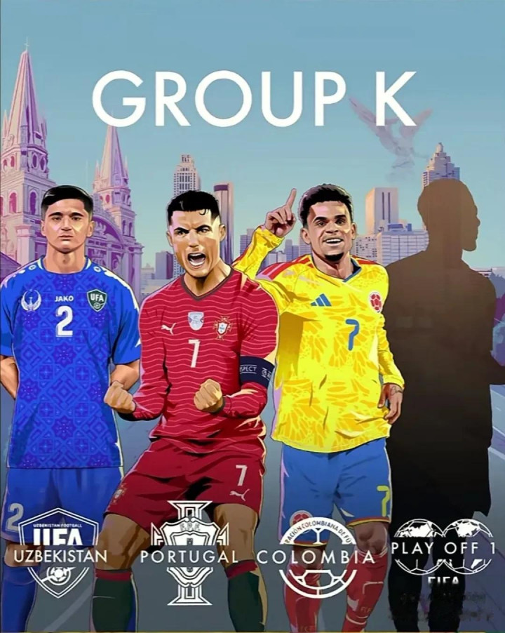 K组的四支球队是葡萄牙、哥伦比亚、乌兹别克斯坦以洲际附加赛一组的晋级球队,也就是新卡里多尼亚、牙买加和民主刚果三支球队的晋级球队。葡萄牙在这个小组的情况还是不错的,乌兹别克斯坦这支球队的实力没有那么强,也可以看看C罗的表现。