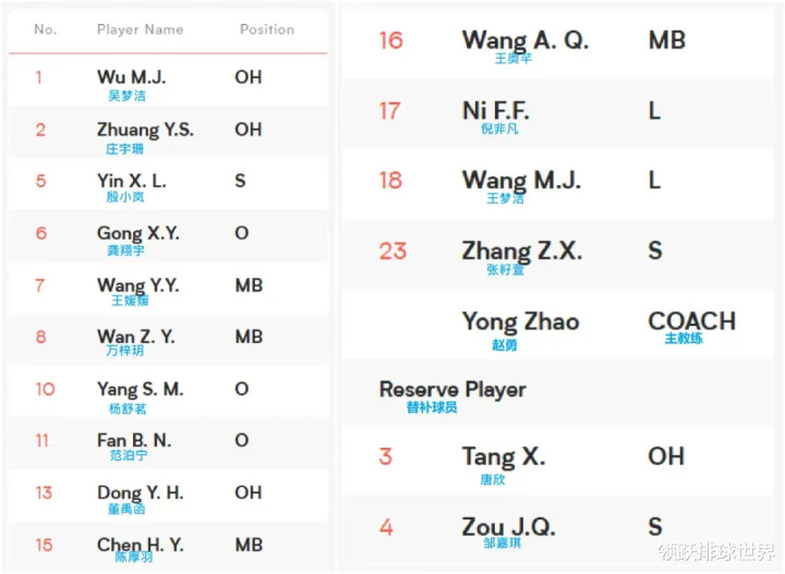 虽然中国排协尚未正式公告名单,但随着土耳其女排、意大利女排等球队已经上报总决赛名单并且公布,北京时间7月21日,联赛官方也悄然同步更新了各队具体名单情况。中国女排14+2人参赛名单已确定,根据21号当天世联赛官网更新的英文版情况,具体如下: